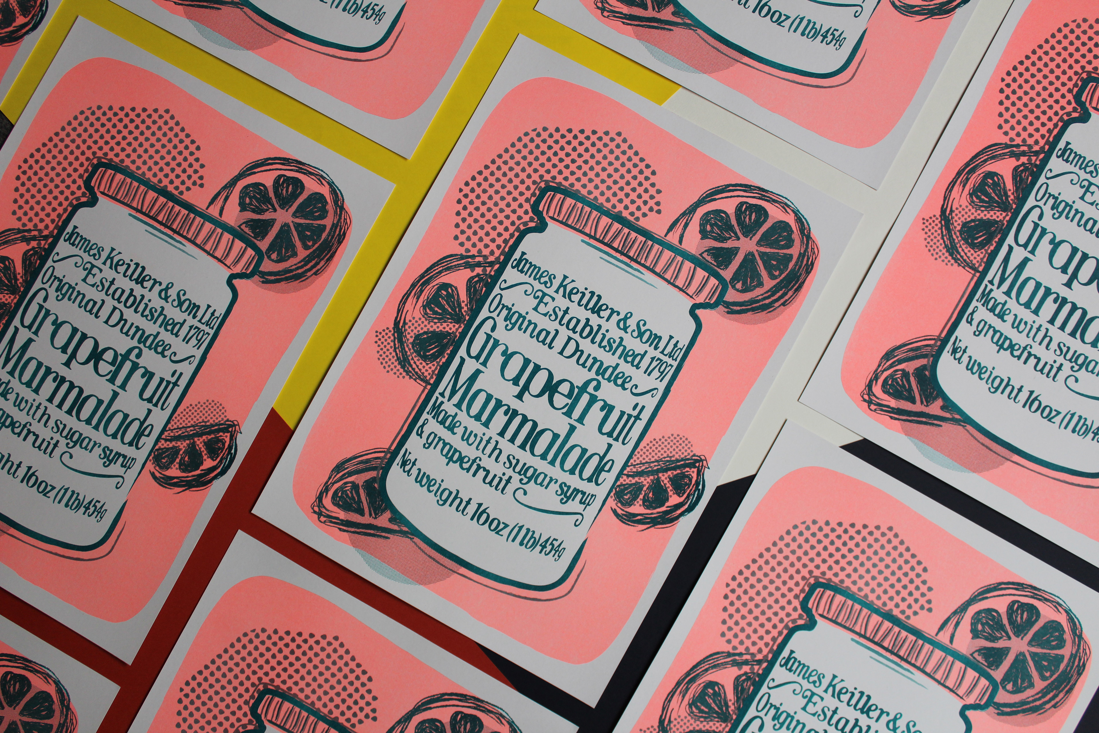 A bold and beautiful Riso print celebrating the iconic Keiller's Marmalade which was made in Dundee. An ode to one of the famous three J's (Jute, Jam and Journalism) – this print puts a quirky twist on a Dundonian treasure. Printed by the lovely folk at Wild Press in Glasgow. This is printed on Context Natural 250gsm paper which a lovely bright off-white recycled stock.