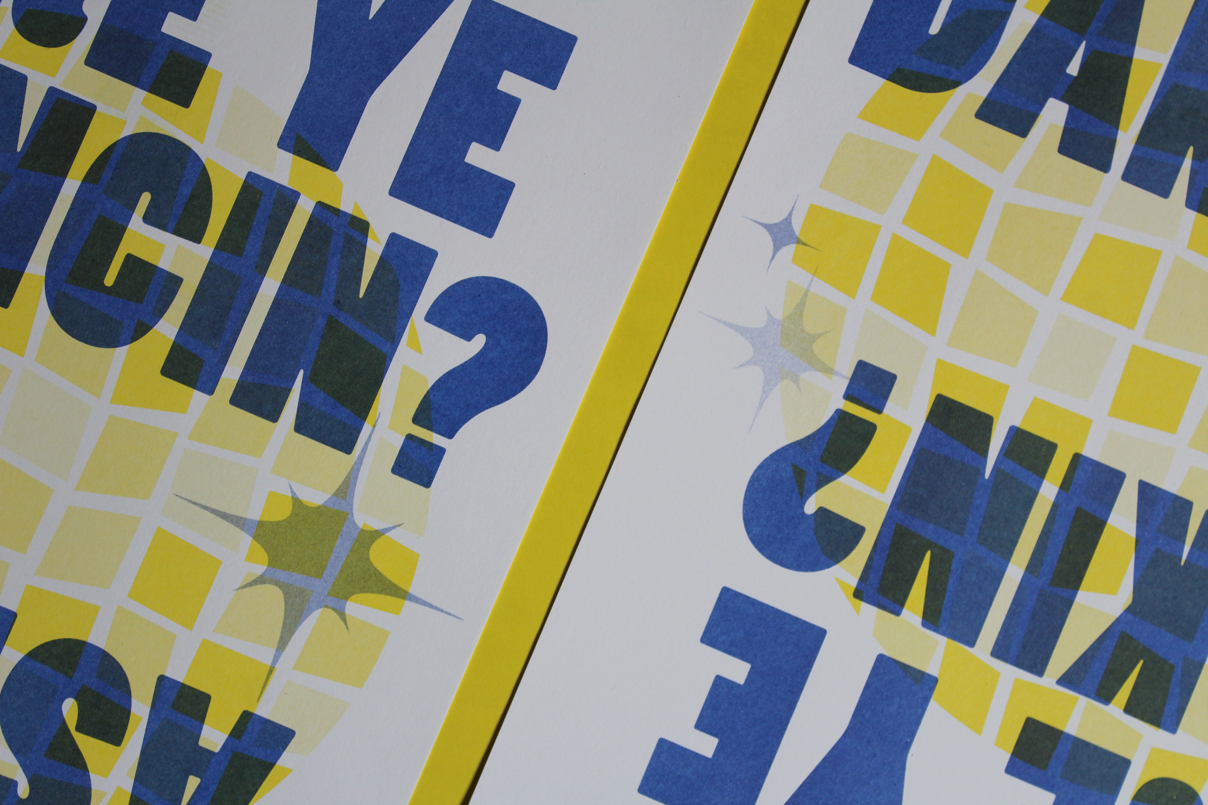 A bold and beautiful Riso print celebrating the well loved and nostalgic Glasgow phrase. For those not in the know, it's a cheeky but sweet way to ask your partner to join you on the dance floor for a boogie! A two colour, limited edition Risograph – printed in beautiful medium blue and yellow inks. Printed by the lovely folk at Yalla Riso on quality Munken Pure Cream 240gsm paper.